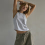 Fabric is soft with a lofty gauze effect, natural slub with high's and low's. Raw edge at bottom opening, binding at neck and arm opening